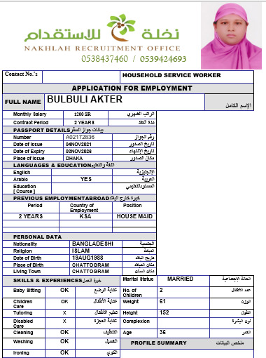 BULBULI AKTER لحجز هذه السيرة اضغط هنا تواصل معنا العودة لصفحة السيرة الذاتية NALLY MONTALLANA CASPE BAKUL BEGUM
