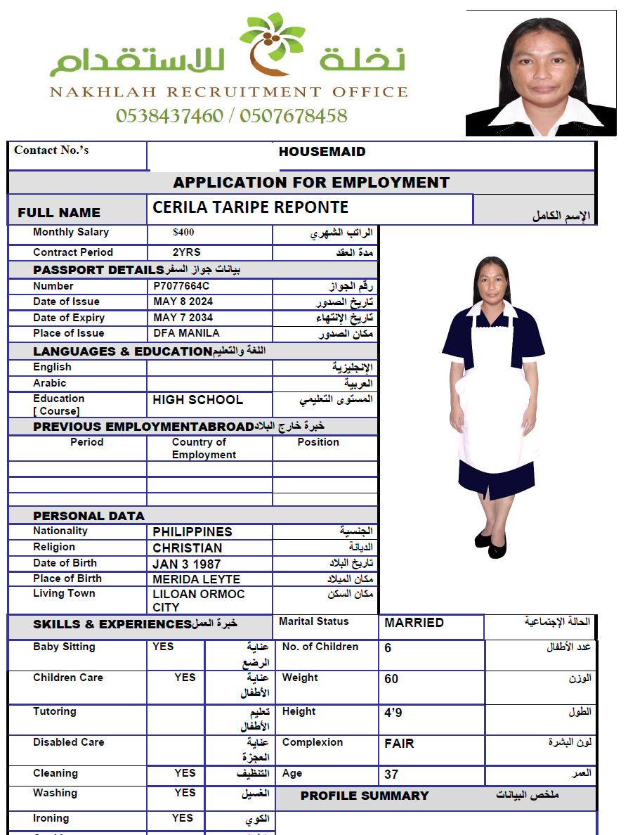 CERILA TARIPE REPONTE لحجز هذه السيرة اضغط هنا تواصل معنا العودة لصفحة السيرة الذاتية ANGELYN CASILLO CASINTAHAN ROWENA PARAISO MARINOG
