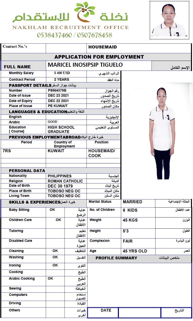 MARICEL INOSIPSIP TIGUELO لحجز هذه السيرة اضغط هنا تواصل معنا العودة لصفحة السيرة الذاتية MOST RIKTA AKTER MANILYN SACIL DEL CASTILLO